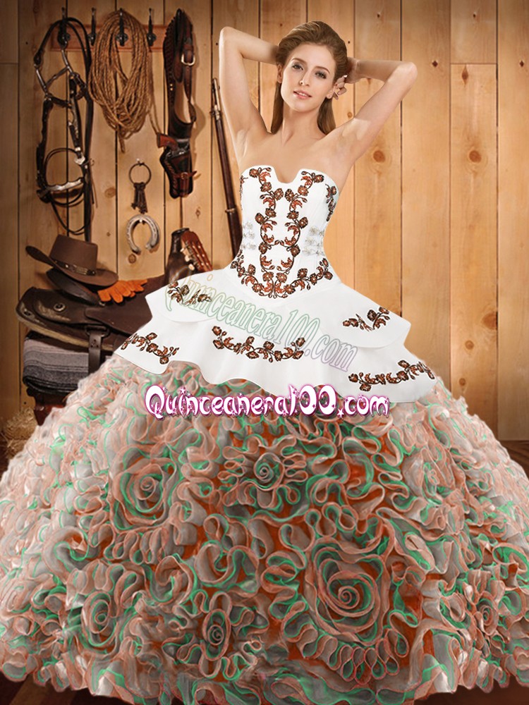 Neckline : StraplessShown Color : Multi-colorSilhouette : Ball GownsSleeve Length : sleevelessHemline : with trainBack Detail : Lace upFabric : Satin,Fabric With Rolling FlowersEmbellishment : EmbroideryOccasion : Military Ball,Sweet 16,QuinceaneraSeason : Spring,Summer,Fall,Winter