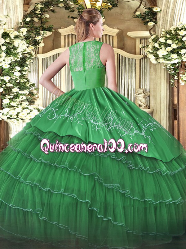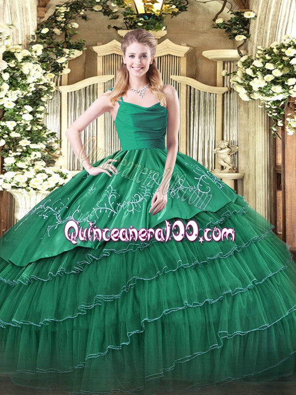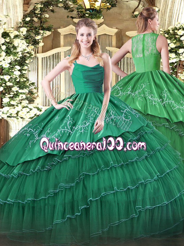 Neckline : StrapsShown Color : Dark GreenSilhouette : Ball GownsSleeve Length : sleevelessHemline : floor lengthBack Detail : ZipperFabric : Organza,TaffetaEmbellishment : Embroidery,Ruffled LayersOccasion : Military Ball,Sweet 16,QuinceaneraSeason : Spring,Summer,Fall,Winter