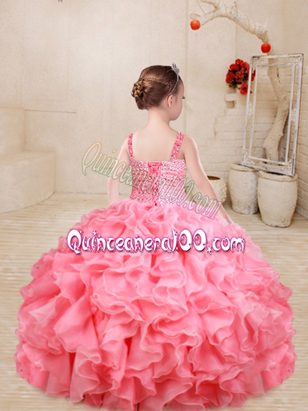 Neckline : StrapsShown Color : Watermelon RedSilhouette : Ball GownsSleeve Length : sleevelessHemline : floor lengthBack Detail : Lace upFabric : OrganzaEmbellishment : Beading,RufflesOccasion : Sweet 16,QuinceaneraSeason : Spring,Summer,Fall,Winter