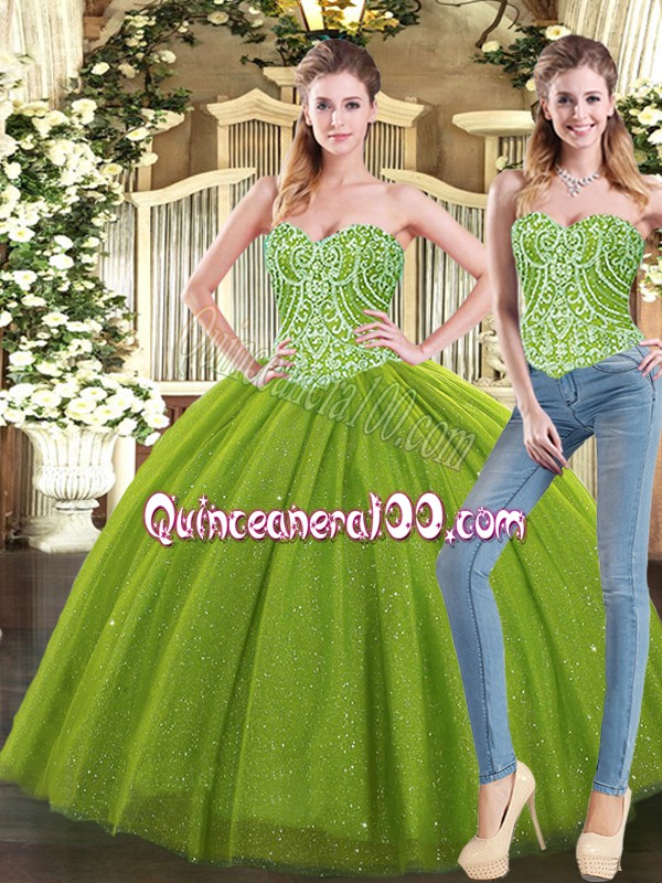 Neckline : SweetheartShown Color : Olive GreenSilhouette : Ball GownsSleeve Length : sleevelessHemline : floor lengthBack Detail : Lace upFabric : TulleEmbellishment : BeadingOccasion : Military Ball,Sweet 16,QuinceaneraSeason : Spring,Summer,Fall,Winter