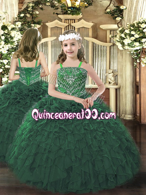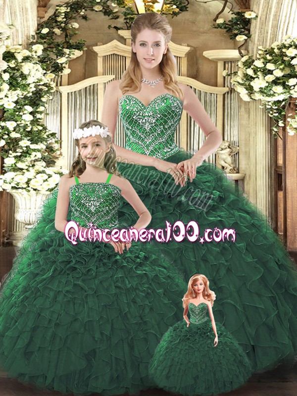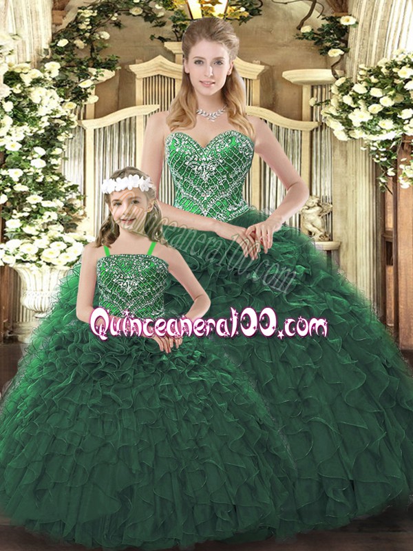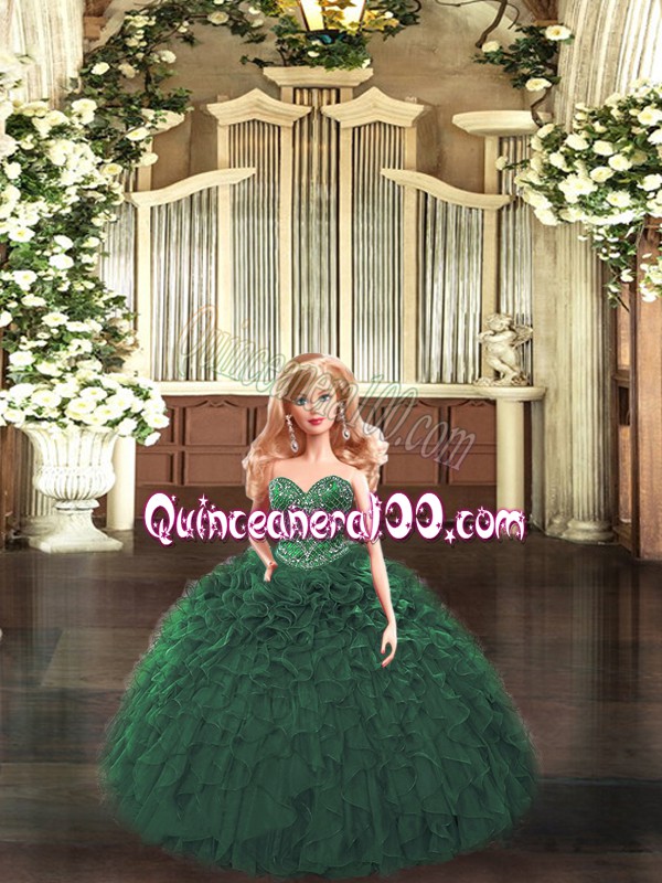 Neckline : SweetheartShown Color : Dark GreenSilhouette : Ball GownsSleeve Length : sleevelessHemline : floor lengthBack Detail : Lace upFabric : OrganzaEmbellishment : RufflesOccasion : Military Ball,Sweet 16,QuinceaneraSeason : Spring,Summer,Fall,Winter