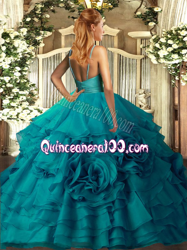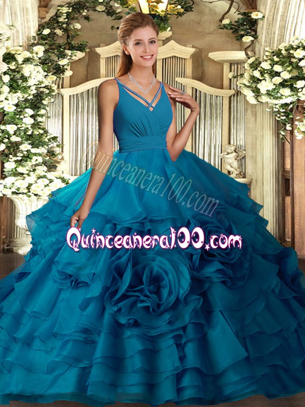 Neckline : V-neckShown Color : Teal Silhouette : Ball GownsSleeve Length : sleevelessHemline : floor lengthBack Detail : Side zipperFabric : OrganzaEmbellishment : Ruffled LayersOccasion : Sweet 16,QuinceaneraSeason : Spring,Summer,Fall,Winter