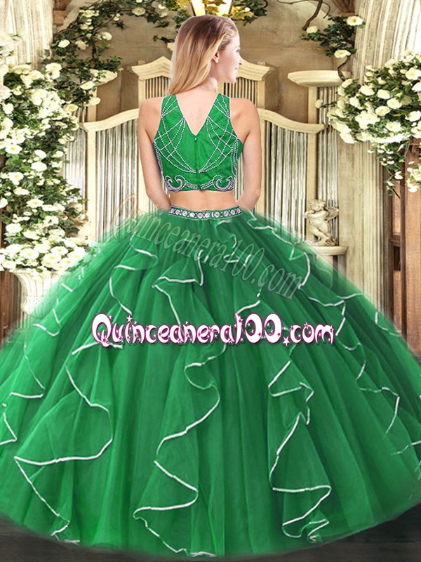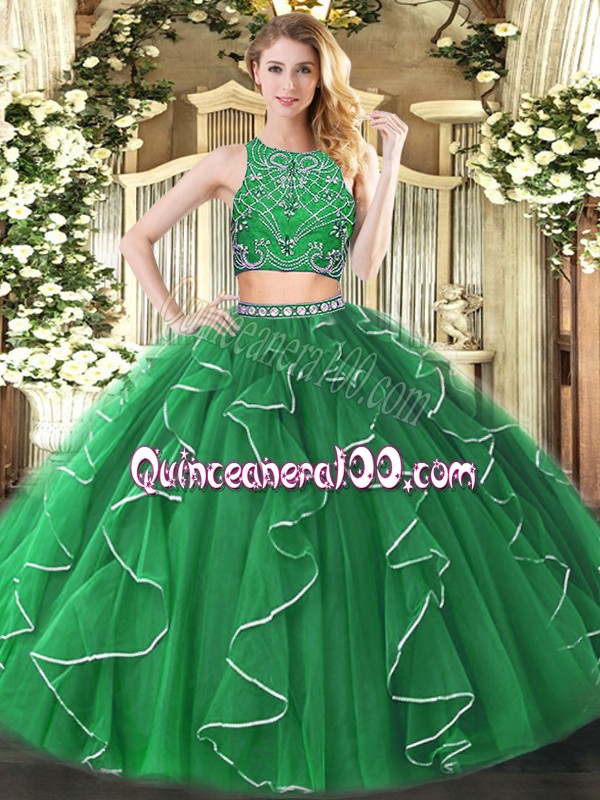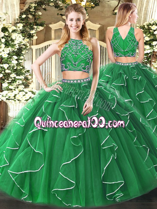 Neckline : High-neckShown Color : GreenSilhouette : Two PiecesSleeve Length : sleevelessHemline : floor lengthBack Detail : ZipperFabric : TulleEmbellishment : Beading,RufflesOccasion : Military Ball,Sweet 16,QuinceaneraSeason : Spring,Summer,Fall,Winter