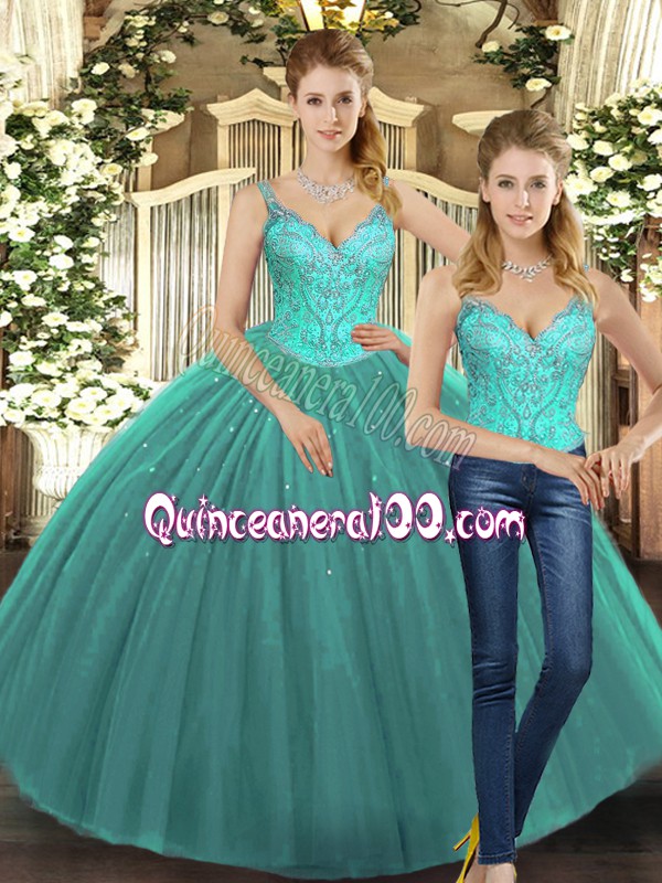 Neckline : StrapsShown Color : TurquoiseSilhouette : Two PiecesSleeve Length : sleevelessHemline : floor lengthBack Detail : Lace upFabric : TulleEmbellishment : BeadingOccasion : Military Ball,Sweet 16,QuinceaneraSeason : Spring,Summer,Fall,Winter
