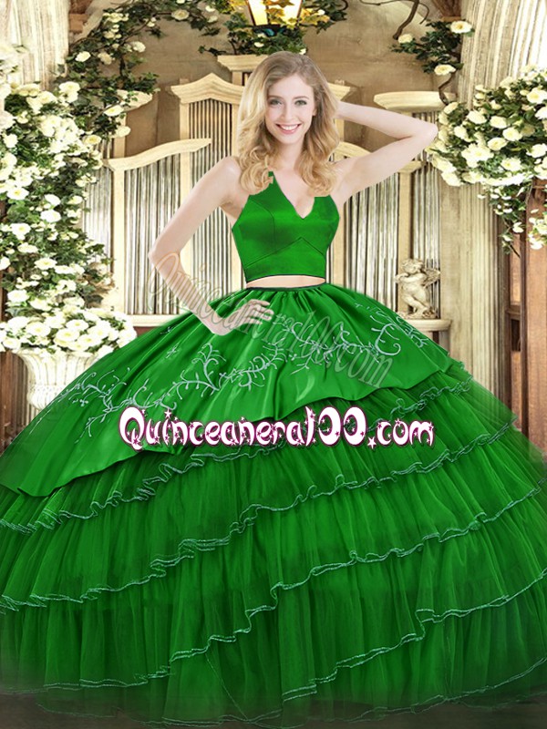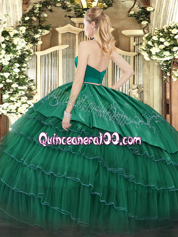Neckline : Halter topShown Color : GreenSilhouette : Two PiecesSleeve Length : sleevelessHemline : floor lengthBack Detail : ZipperFabric : TulleEmbellishment : EmbroideryOccasion : Military Ball,Sweet 16,QuinceaneraSeason : Spring,Summer,Fall,Winter