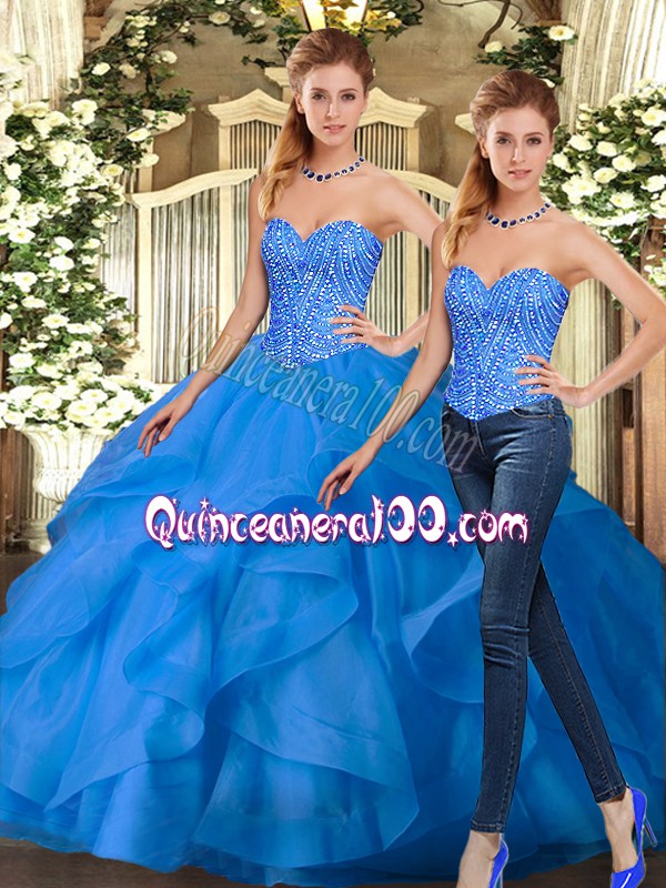 Neckline : SweetheartShown Color : BlueSilhouette : Two PiecesSleeve Length : sleevelessHemline : floor lengthBack Detail : Lace upFabric : OrganzaEmbellishment : Beading,RufflesOccasion : Military Ball,Sweet 16,QuinceaneraSeason : Spring,Summer,Fall,Winter