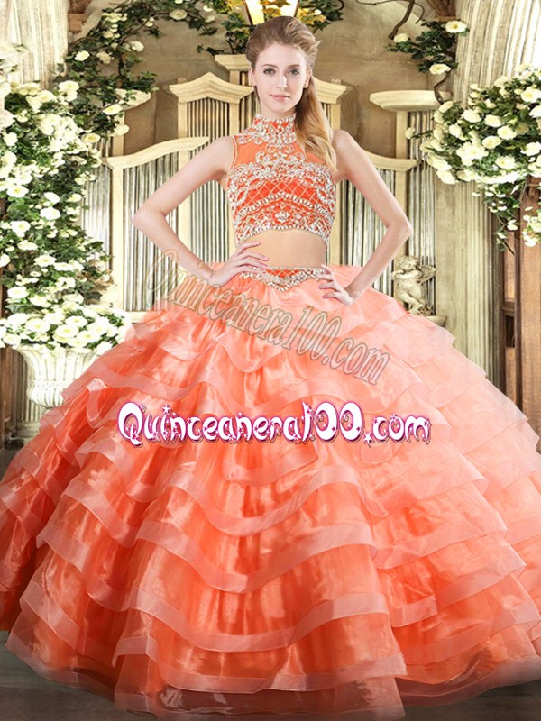 Neckline : High-neckShown Color : Orange RedSilhouette : Two PiecesSleeve Length : sleevelessHemline : floor lengthBack Detail : BacklessFabric : TulleEmbellishment : Beading,Ruffled LayersOccasion : Military Ball,Sweet 16,QuinceaneraSeason : Spring,Summer,Fall,Winter