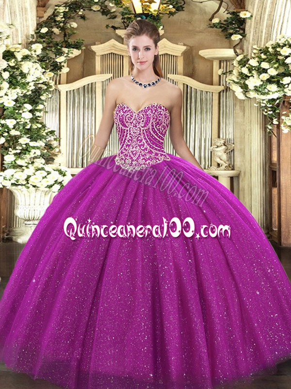 Neckline : SweetheartShown Color : FuchsiaSilhouette : Ball GownsSleeve Length : sleevelessHemline : floor lengthBack Detail : Lace upFabric : TulleEmbellishment : BeadingOccasion : Military Ball,Sweet 16,QuinceaneraSeason : Spring,Summer,Fall,Winter