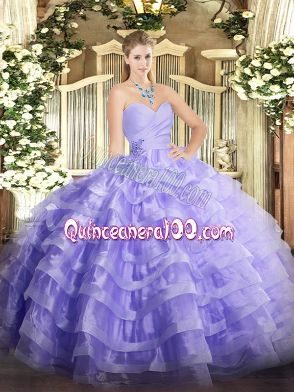 Neckline : SweetheartShown Color : LavenderSilhouette : Ball GownsSleeve Length : sleevelessHemline : floor lengthBack Detail : Lace upFabric : OrganzaEmbellishment : Beading,Ruffled LayersOccasion : Military Ball,Sweet 16,QuinceaneraSeason : Spring,Summer,Fall,Winter