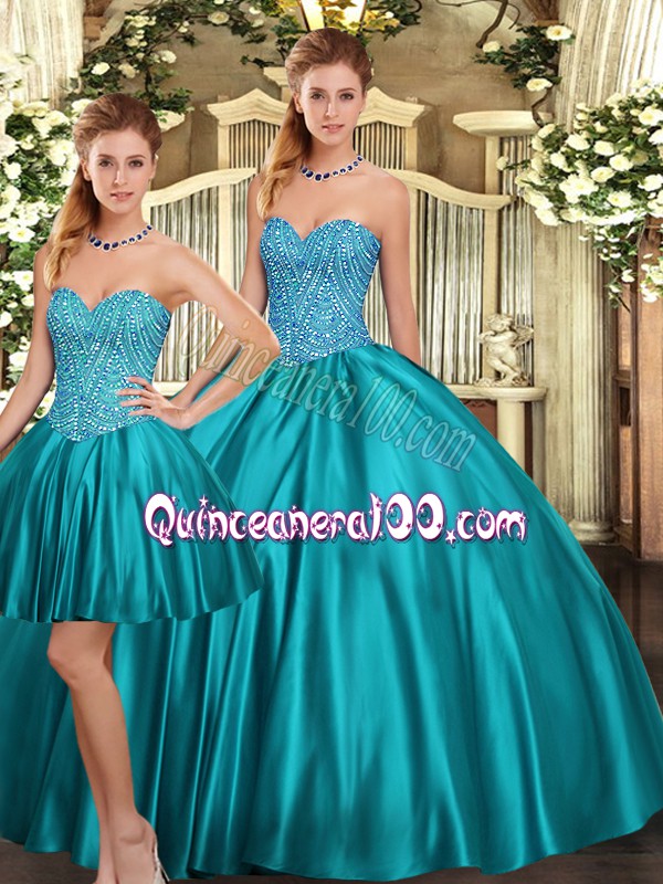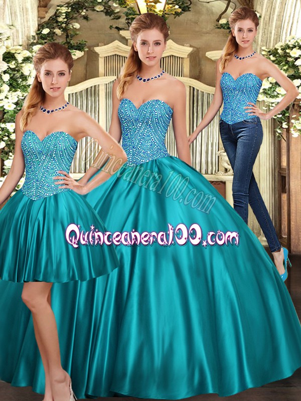 Neckline : SweetheartShown Color : Teal Silhouette : Three PiecesSleeve Length : sleevelessHemline : floor lengthBack Detail : Lace upFabric : TulleEmbellishment : BeadingOccasion : Military Ball,Sweet 16,QuinceaneraSeason : Spring,Summer,Fall,Winter