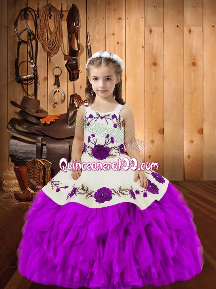 Neckline : StrapsShown Color : PurpleSilhouette : Ball GownsSleeve Length : sleevelessHemline : floor lengthBack Detail : Lace upFabric : OrganzaEmbellishment : Embroidery,RufflesOccasion : Sweet 16,QuinceaneraSeason : Spring,Summer,Fall,Winter