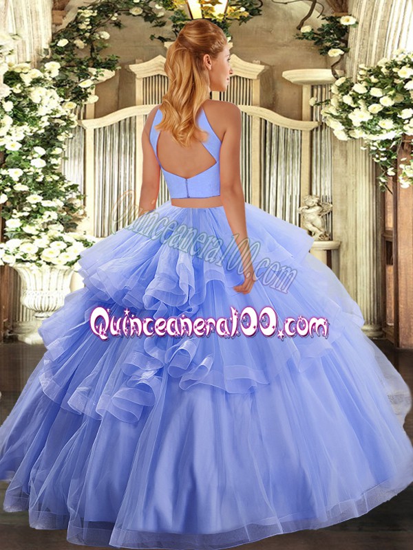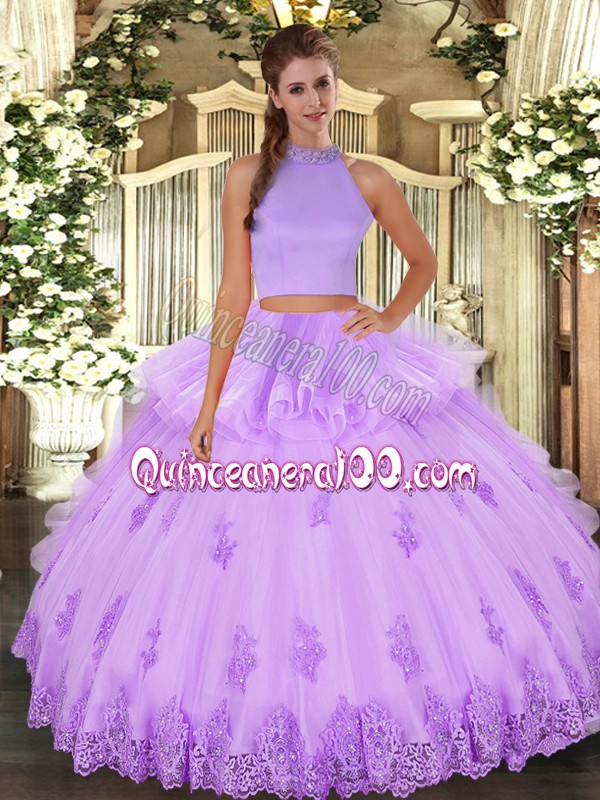 Neckline : Halter topShown Color : LavenderSilhouette : Two PiecesSleeve Length : sleevelessHemline : floor lengthBack Detail : BacklessFabric : TulleEmbellishment : Beading,Appliques,RufflesOccasion : Military Ball,Sweet 16,QuinceaneraSeason : Spring,Summer,Fall,Winter