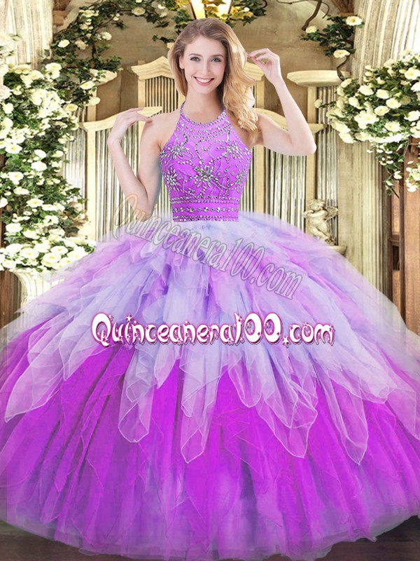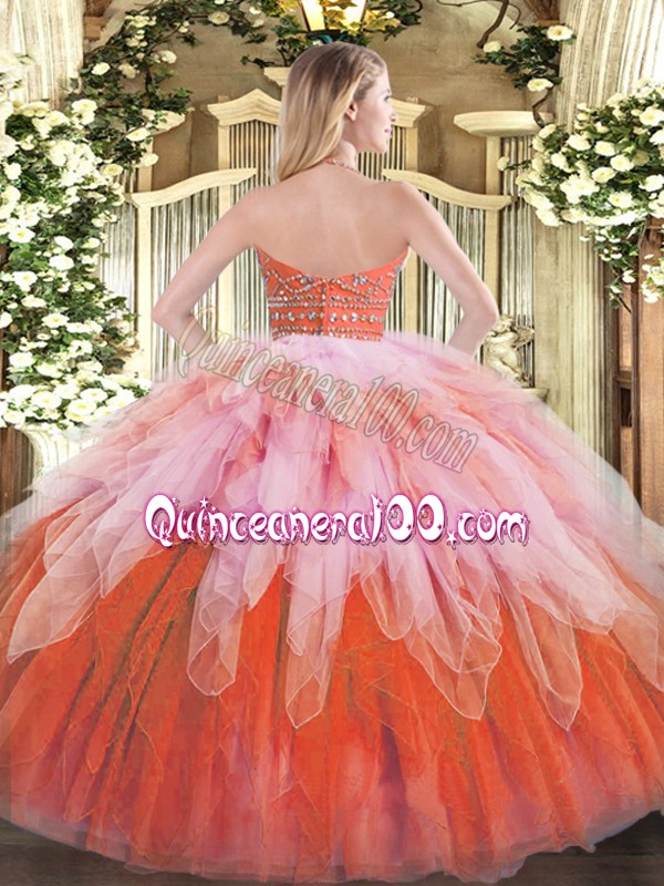 Neckline : Halter topShown Color : Multi-colorSilhouette : Ball GownsSleeve Length : sleevelessHemline : floor lengthBack Detail : ZipperFabric : TulleEmbellishment : Beading,RufflesOccasion : Military Ball,Sweet 16,QuinceaneraSeason : Spring,Summer,Fall,Winter
