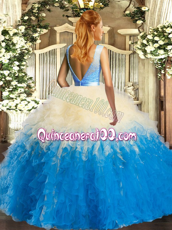 Neckline : ScoopShown Color : Multi-colorSilhouette : Ball GownsSleeve Length : sleevelessHemline : floor lengthBack Detail : BacklessFabric : OrganzaEmbellishment : Lace,RufflesOccasion : Military Ball,Sweet 16,QuinceaneraSeason : Spring,Summer,Fall,Winter