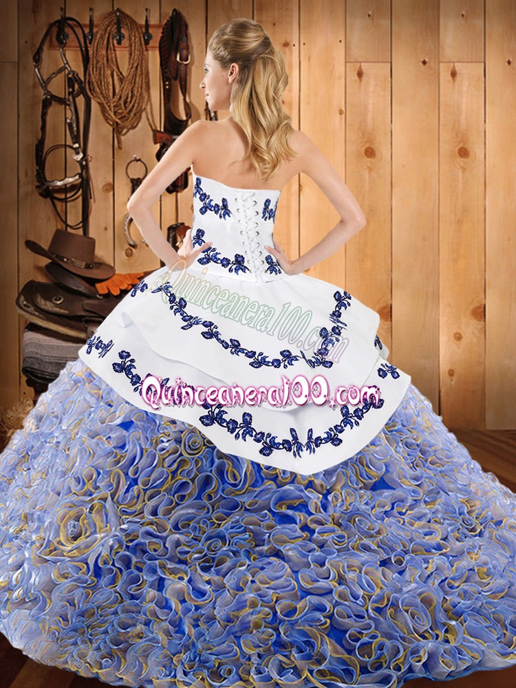 Neckline : StraplessShown Color : Multi-colorSilhouette : Ball GownsSleeve Length : sleevelessHemline : with trainBack Detail : Lace upFabric : Satin,Fabric With Rolling FlowersEmbellishment : EmbroideryOccasion : Military Ball,Sweet 16,QuinceaneraSeason : Spring,Summer,Fall,Winter