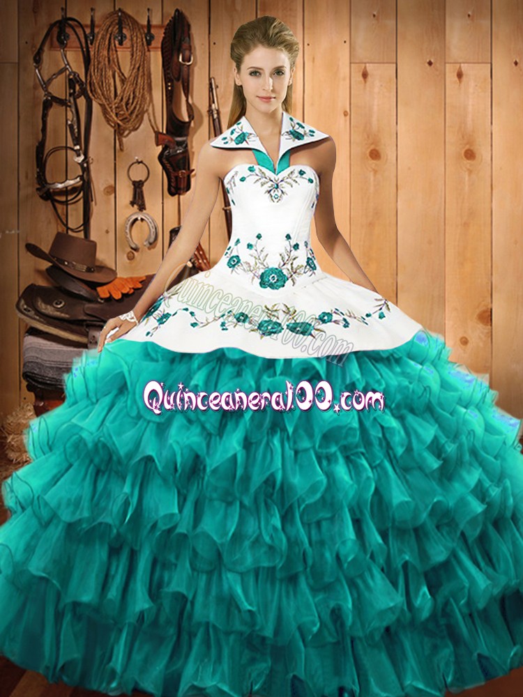 Neckline : Halter topShown Color : TurquoiseSilhouette : Ball GownsSleeve Length : sleevelessHemline : floor lengthBack Detail : Lace upFabric : OrganzaEmbellishment : Embroidery,Ruffled LayersOccasion : Military Ball,Sweet 16,QuinceaneraSeason : Spring,Summer,Fall,Winter
