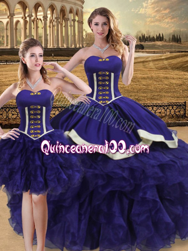 Neckline : SweetheartShown Color : PurpleSilhouette : Three PiecesSleeve Length : sleevelessHemline : floor lengthBack Detail : Lace upFabric : OrganzaEmbellishment : Beading,RufflesOccasion : Sweet 16,QuinceaneraSeason : Spring,Summer,Fall,Winter
