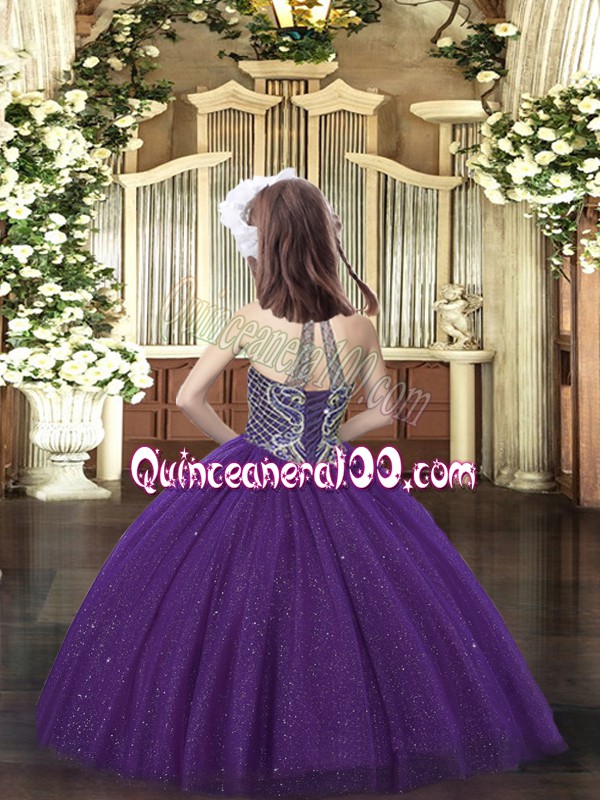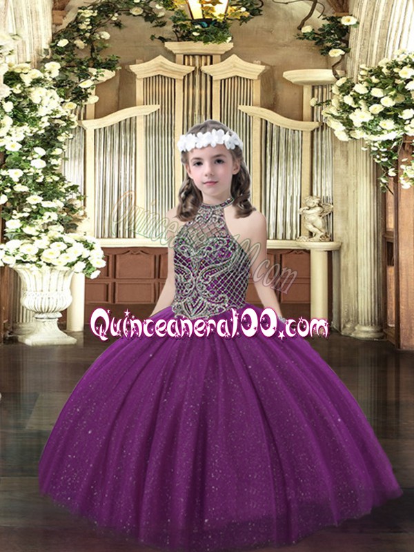 Neckline : Halter topShown Color : Dark PurpleSilhouette : Ball GownsSleeve Length : sleevelessHemline : floor lengthBack Detail : Lace upFabric : TulleEmbellishment : BeadingOccasion : Party,QuinceaneraSeason : Spring,Summer,Fall,Winter