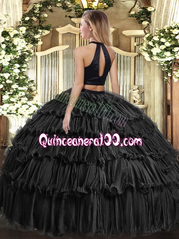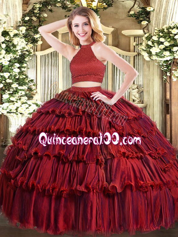 Neckline : Halter topShown Color : Wine RedSilhouette : Ball GownsSleeve Length : sleevelessHemline : floor lengthBack Detail : BacklessFabric : OrganzaEmbellishment : Beading,Ruffled LayersOccasion : Military Ball,Sweet 16,QuinceaneraSeason : Spring,Summer,Fall,Winter