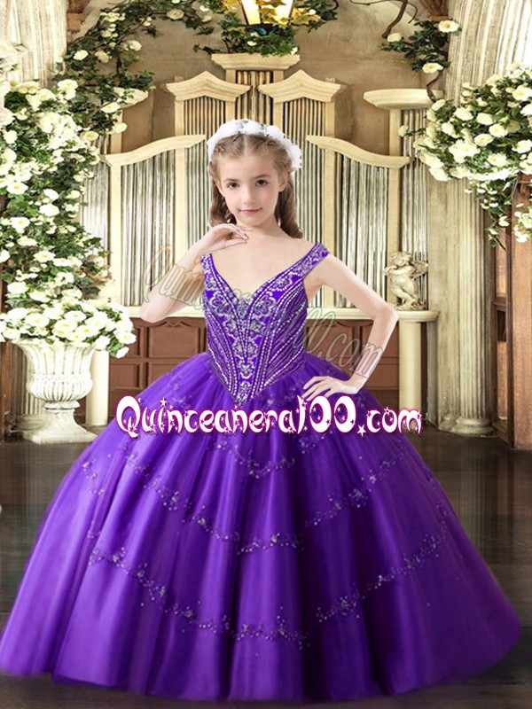 Neckline : V-neckShown Color : PurpleSilhouette : Ball GownsSleeve Length : sleevelessHemline : floor lengthBack Detail : Lace upFabric : TulleEmbellishment : Beading,AppliquesOccasion : Party,QuinceaneraSeason : Spring,Summer,Fall,Winter