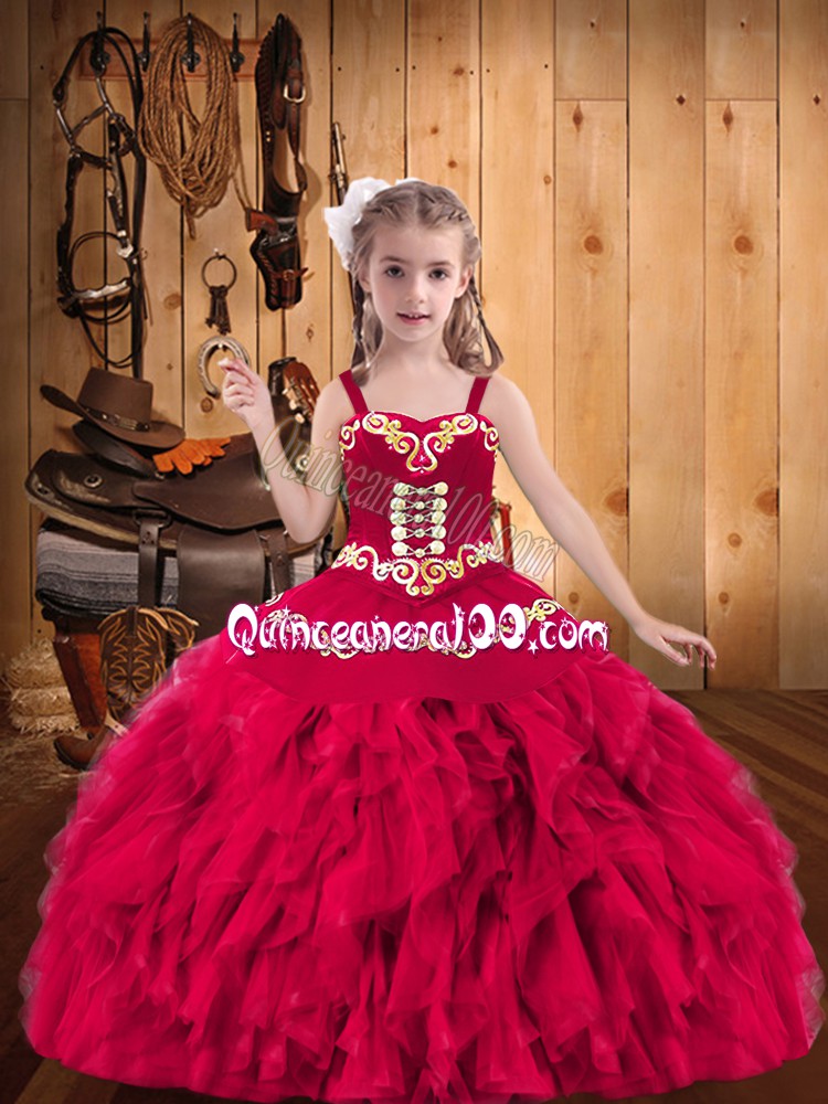 Neckline : StrapsShown Color : Coral RedSilhouette : Ball GownsSleeve Length : sleevelessHemline : floor lengthBack Detail : Lace upFabric : OrganzaEmbellishment : Embroidery,RufflesOccasion : Party,Sweet 16,Quinceanera,Wedding PartySeason : Spring,Summer,Fall,Winter