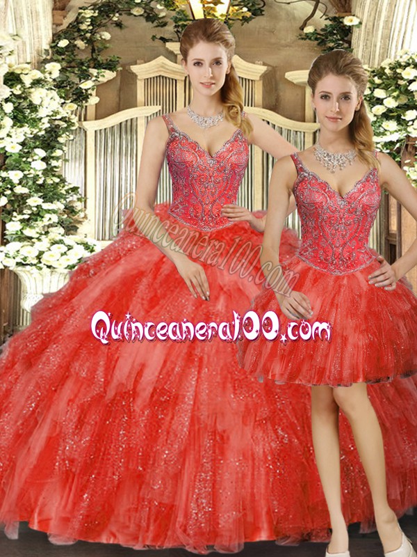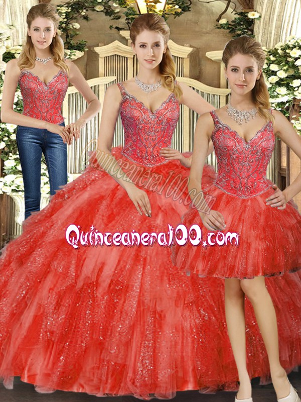 Neckline : StrapsShown Color : RedSilhouette : Three PiecesSleeve Length : sleevelessHemline : floor lengthBack Detail : Lace upFabric : OrganzaEmbellishment : Beading,RufflesOccasion : Military Ball,Sweet 16,QuinceaneraSeason : Spring,Summer,Fall,Winter