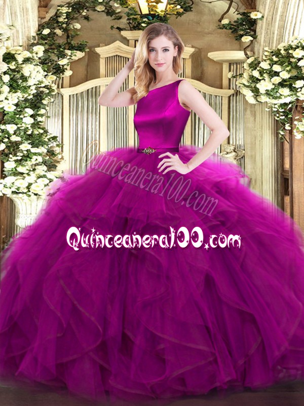 Neckline : ScoopShown Color : FuchsiaSilhouette : Ball GownsSleeve Length : sleevelessHemline : floor lengthBack Detail : Clasp handleFabric : OrganzaEmbellishment : RufflesOccasion : Military Ball,Sweet 16,QuinceaneraSeason : Spring,Summer,Fall,Winter
