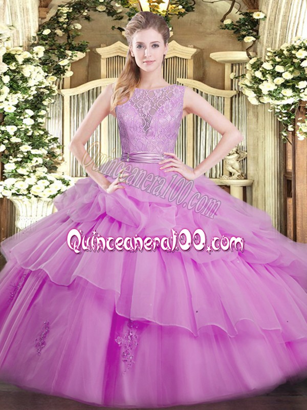 Neckline : ScoopShown Color : LilacSilhouette : Ball GownsSleeve Length : sleevelessHemline : floor lengthBack Detail : BacklessFabric : OrganzaEmbellishment : Lace,Ruffled LayersOccasion : Military Ball,Sweet 16,QuinceaneraSeason : Spring,Summer,Fall,Winter
