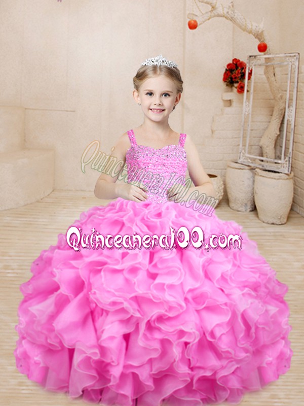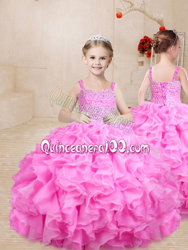 Neckline : StrapsShown Color : Rose Pink Silhouette : Ball GownsSleeve Length : sleevelessHemline : floor lengthBack Detail : Lace upFabric : OrganzaEmbellishment : Beading,RufflesOccasion : Sweet 16,QuinceaneraSeason : Spring,Summer,Fall,Winter
