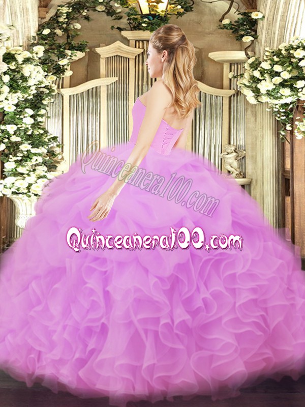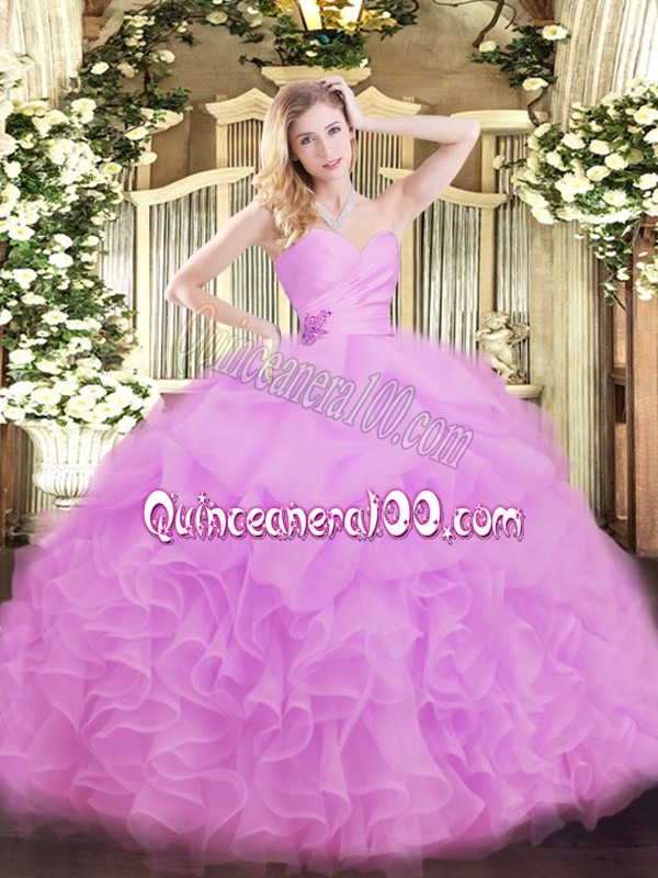 Neckline : SweetheartShown Color : LilacSilhouette : Ball GownsSleeve Length : sleevelessHemline : floor lengthBack Detail : Lace upFabric : OrganzaEmbellishment : Beading,RufflesOccasion : Military Ball,Sweet 16,QuinceaneraSeason : Spring,Summer,Fall,Winter