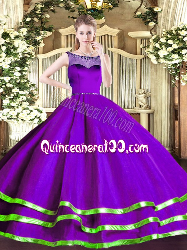 Neckline : ScoopShown Color : PurpleSilhouette : Ball GownsSleeve Length : sleevelessHemline : floor lengthBack Detail : ZipperFabric : OrganzaEmbellishment : Beading,Ruffled LayersOccasion : Sweet 16,QuinceaneraSeason : Spring,Summer,Fall,Winter