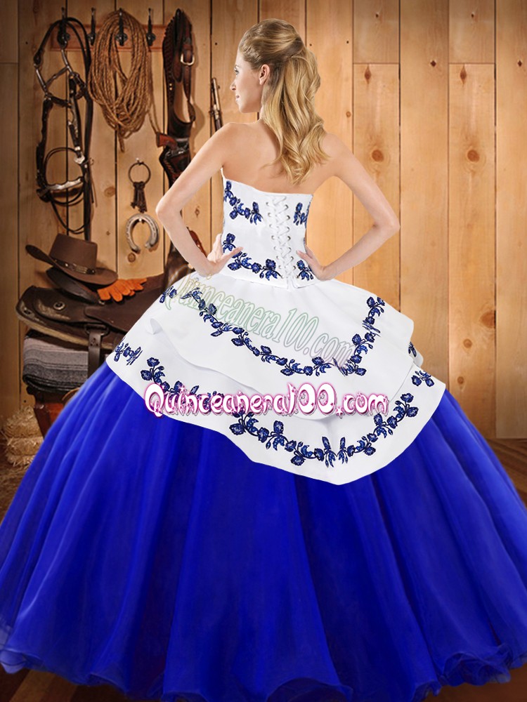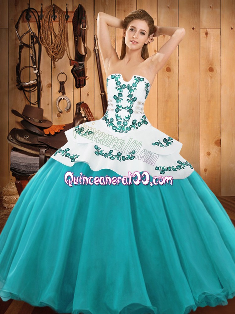 Neckline : StraplessShown Color : Teal Silhouette : Ball GownsSleeve Length : sleevelessHemline : floor lengthBack Detail : Lace upFabric : Satin,OrganzaEmbellishment : EmbroideryOccasion : Military Ball,Sweet 16,QuinceaneraSeason : Spring,Summer,Fall,Winter