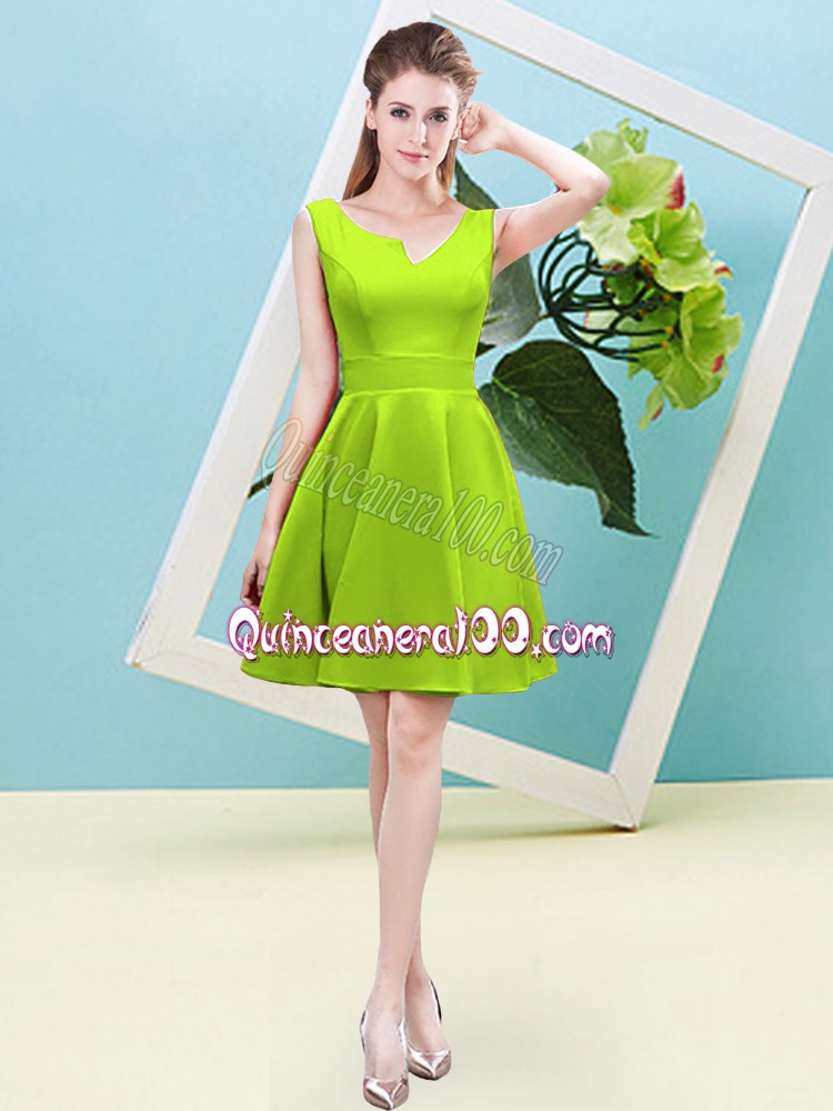 Neckline : AsymmetricShown Color : Yellow GreenSilhouette : A-lineSleeve Length : sleevelessHemline : mini lengthBack Detail : ZipperFabric : SatinEmbellishment : RuchingOccasion : Prom,Party,Wedding PartySeason : Spring,Summer,Fall