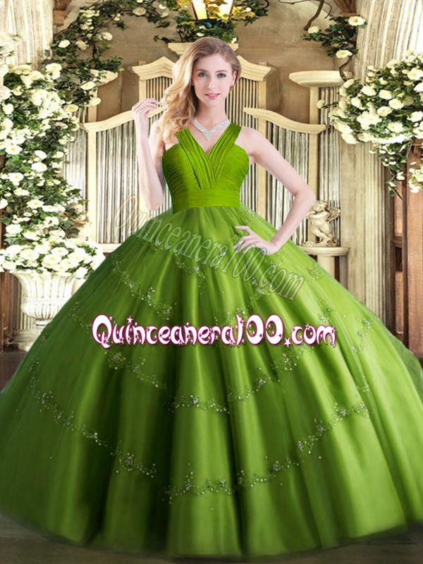 Neckline : V-neckShown Color : Olive GreenSilhouette : Ball GownsSleeve Length : sleevelessHemline : floor lengthBack Detail : ZipperFabric : TulleEmbellishment : BeadingOccasion : Military Ball,Sweet 16,QuinceaneraSeason : Spring,Summer,Fall,Winter