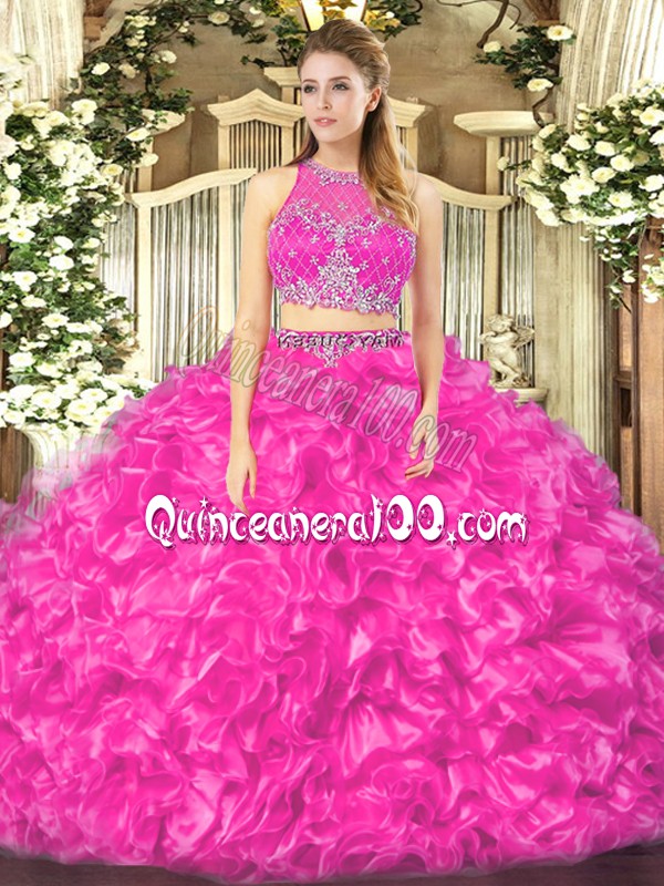 Neckline : ScoopShown Color : FuchsiaSilhouette : Ball GownsSleeve Length : sleevelessHemline : floor lengthBack Detail : ZipperFabric : OrganzaEmbellishment : Beading,RufflesOccasion : Military Ball,Sweet 16,QuinceaneraSeason : Spring,Summer,Fall,Winter