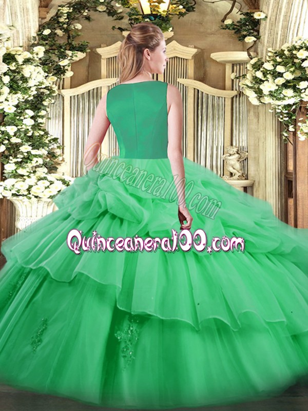 Neckline : ScoopShown Color : Spring GreenSilhouette : Ball GownsSleeve Length : sleevelessHemline : floor lengthBack Detail : Side zipperFabric : OrganzaEmbellishment : Beading,Pick UpsOccasion : Sweet 16,QuinceaneraSeason : Spring,Summer,Fall,Winter