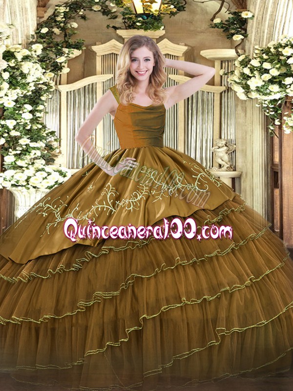 Neckline : StrapsShown Color : BrownSilhouette : Ball GownsSleeve Length : sleevelessHemline : floor lengthBack Detail : ZipperFabric : Satin,OrganzaEmbellishment : Embroidery,Ruffled LayersOccasion : Military Ball,Sweet 16,QuinceaneraSeason : Spring,Summer,Fall,Winter