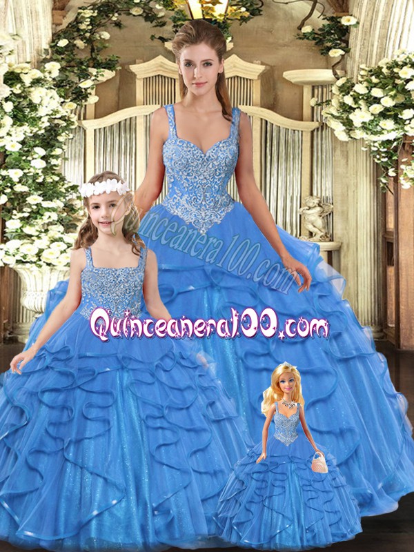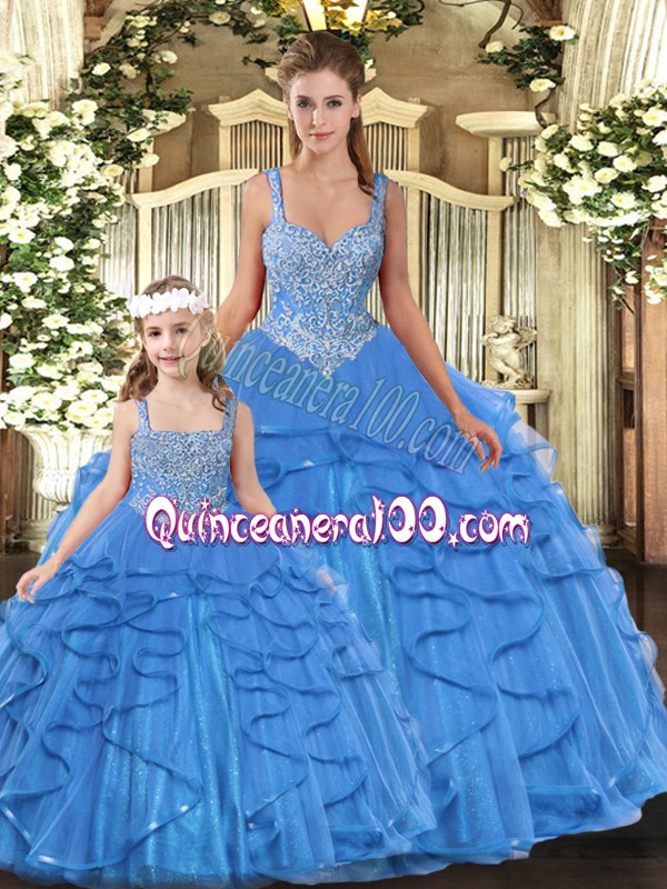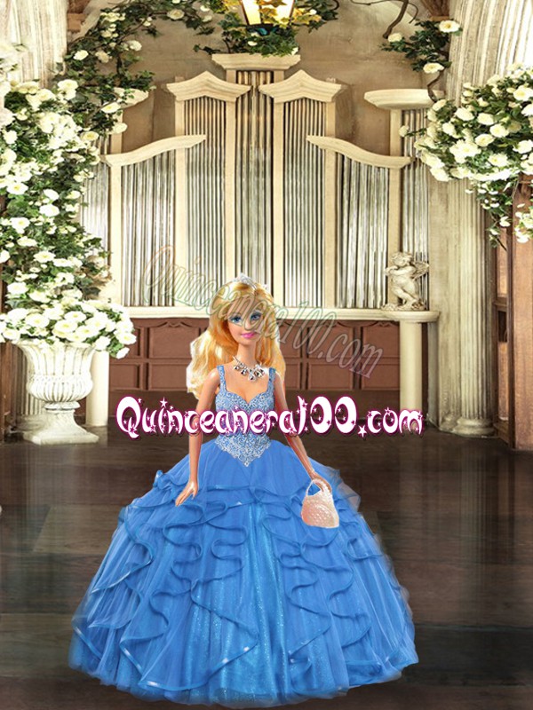 Neckline : StrapsShown Color : Baby BlueSilhouette : Ball GownsSleeve Length : sleevelessHemline : floor lengthBack Detail : Lace upFabric : TulleEmbellishment : Beading,RufflesOccasion : Military Ball,Sweet 16,QuinceaneraSeason : Spring,Summer,Fall,Winter