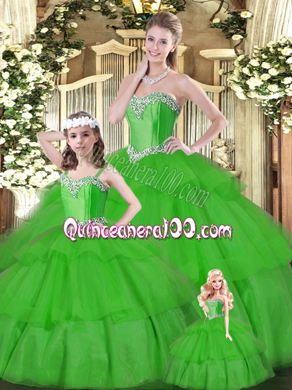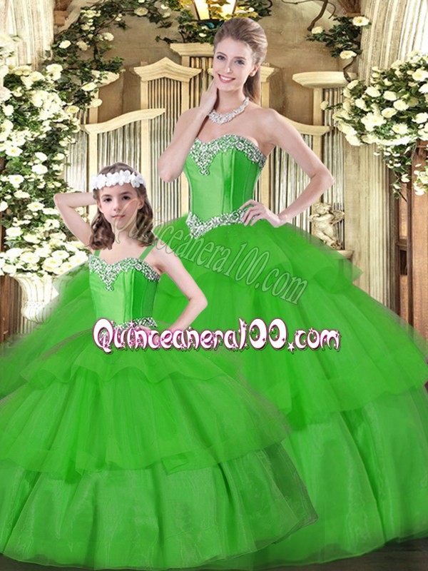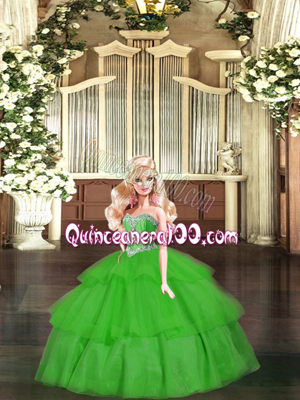 Neckline : SweetheartShown Color : GreenSilhouette : Ball GownsSleeve Length : sleevelessHemline : floor lengthBack Detail : Lace upFabric : OrganzaEmbellishment : Beading,Ruffled LayersOccasion : Military Ball,Sweet 16,QuinceaneraSeason : Spring,Summer,Fall,Winter