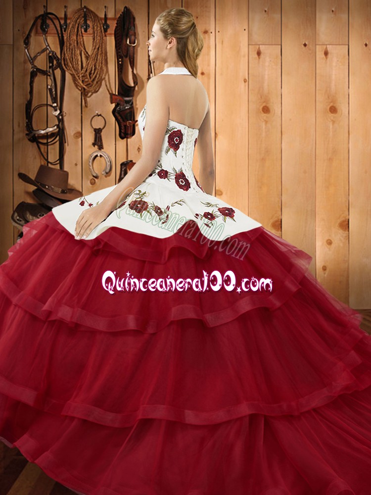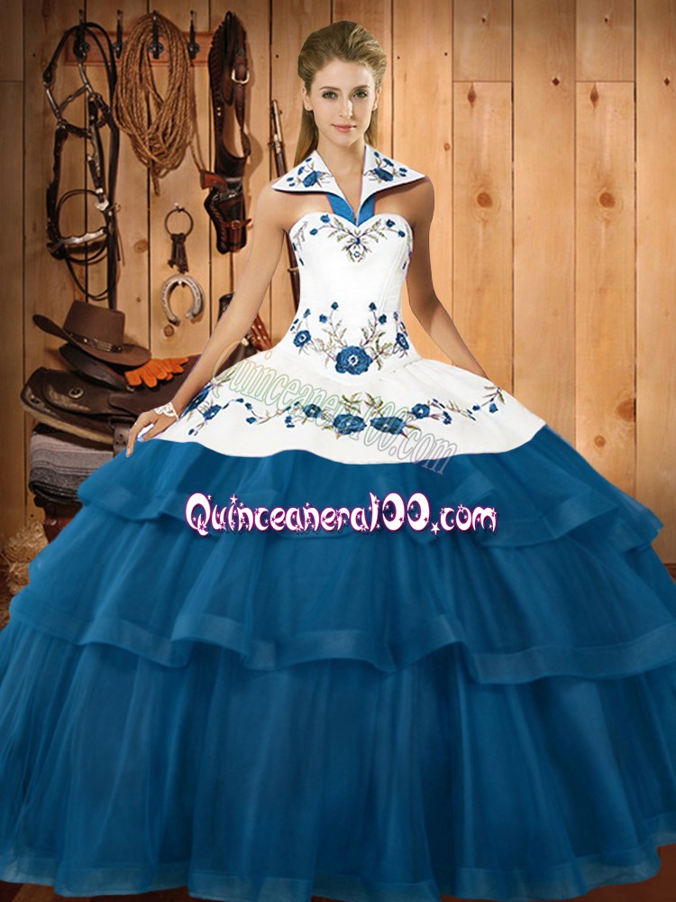 Neckline : Halter topShown Color : BlueSilhouette : Ball GownsSleeve Length : sleevelessBack Detail : Lace upFabric : OrganzaEmbellishment : Embroidery,Ruffled LayersOccasion : Military Ball,Sweet 16,QuinceaneraSeason : Spring,Summer,Fall,Winter