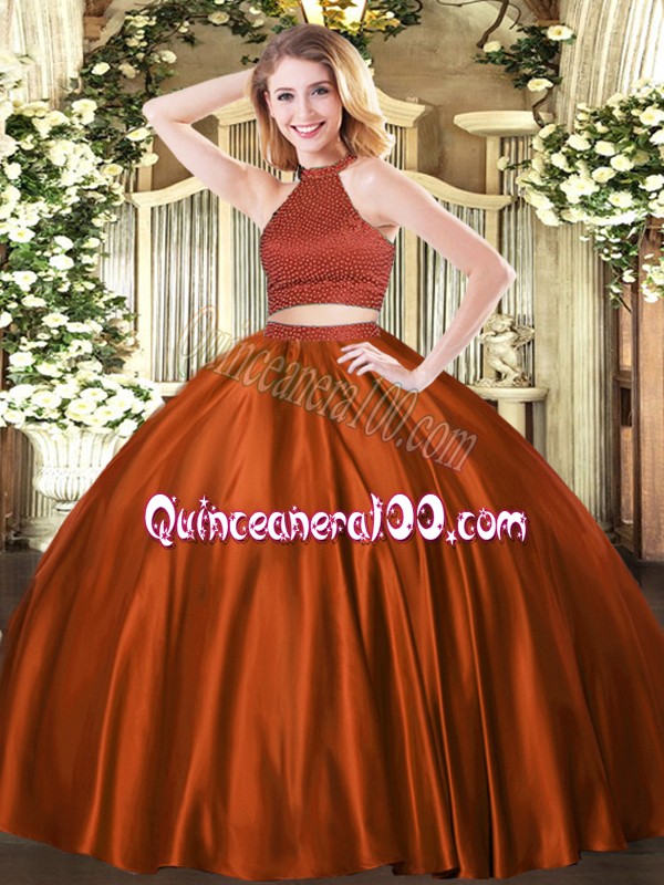 Neckline : Halter topShown Color : Rust RedSilhouette : Ball GownsSleeve Length : sleevelessHemline : floor lengthBack Detail : BacklessFabric : TulleEmbellishment : BeadingOccasion : Military Ball,Sweet 16,QuinceaneraSeason : Spring,Summer,Fall,Winter