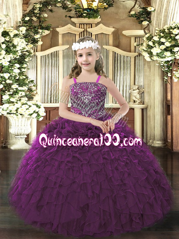 Neckline : StrapsShown Color : Dark PurpleSilhouette : Ball GownsSleeve Length : sleevelessHemline : floor lengthBack Detail : Lace upFabric : OrganzaEmbellishment : Beading,RufflesOccasion : Party,QuinceaneraSeason : Spring,Summer,Fall,Winter