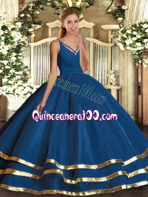 Neckline : V-neckShown Color : BlueSilhouette : A-lineSleeve Length : sleevelessHemline : floor lengthBack Detail : BacklessFabric : OrganzaEmbellishment : Ruffled LayersOccasion : Sweet 16,QuinceaneraSeason : Spring,Summer,Fall,Winter