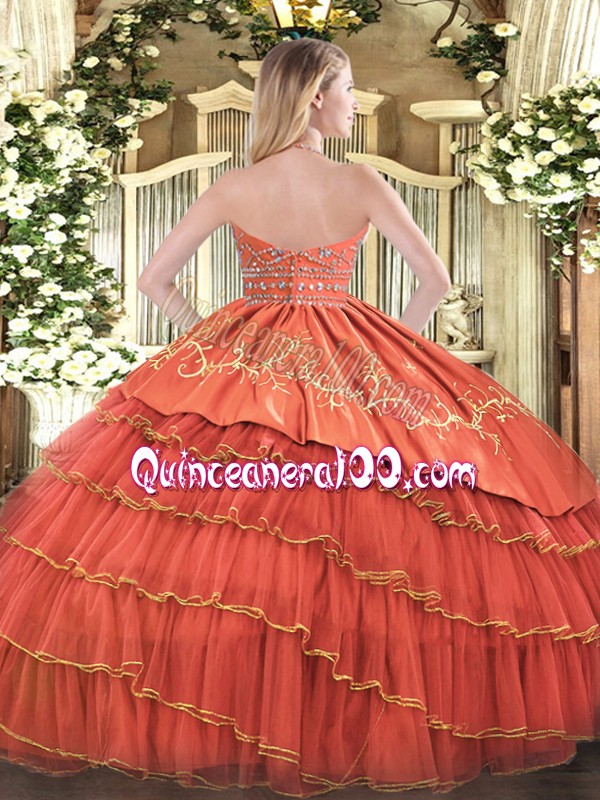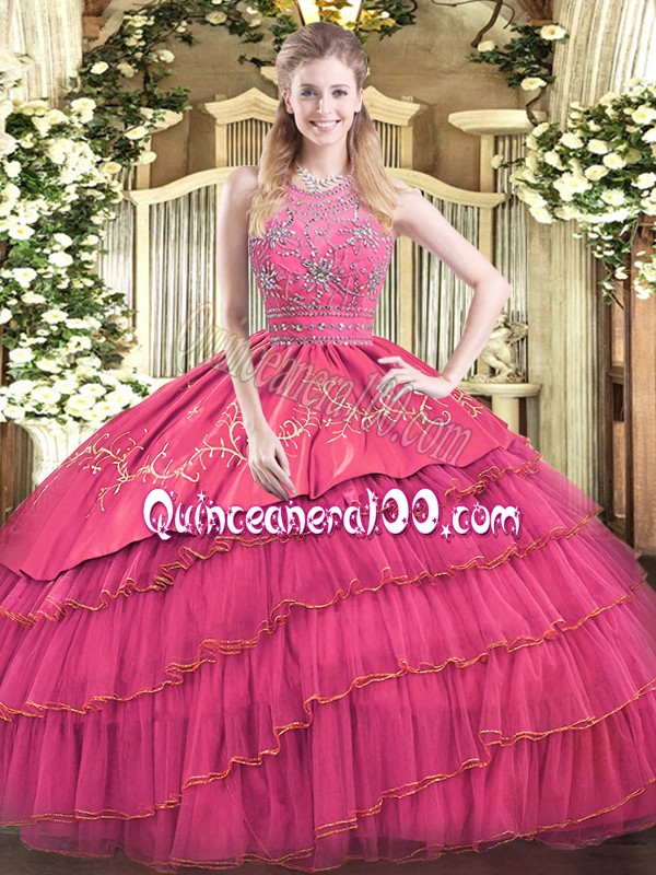 Neckline : Halter topShown Color : Hot PinkSilhouette : Ball GownsSleeve Length : sleevelessHemline : floor lengthBack Detail : ZipperFabric : Satin,TulleEmbellishment : Beading,Embroidery,Ruffled LayersOccasion : Military Ball,Sweet 16,QuinceaneraSeason : Spring,Summer,Fall,Winter