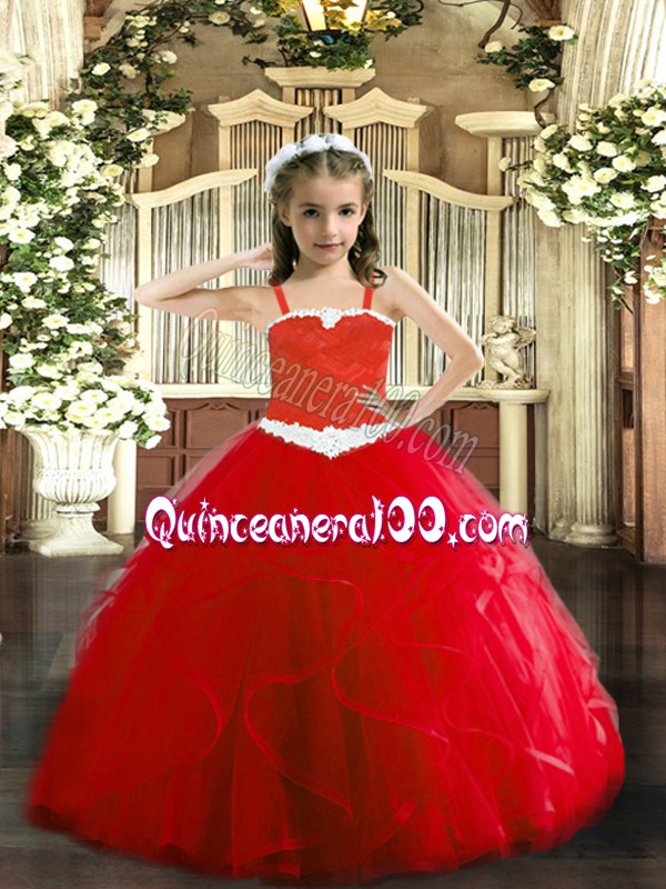 Neckline : StrapsShown Color : RedSilhouette : Ball GownsSleeve Length : sleevelessHemline : floor lengthBack Detail : Lace upFabric : TulleEmbellishment : Appliques,RufflesOccasion : Party,QuinceaneraSeason : Spring,Summer,Fall,Winter