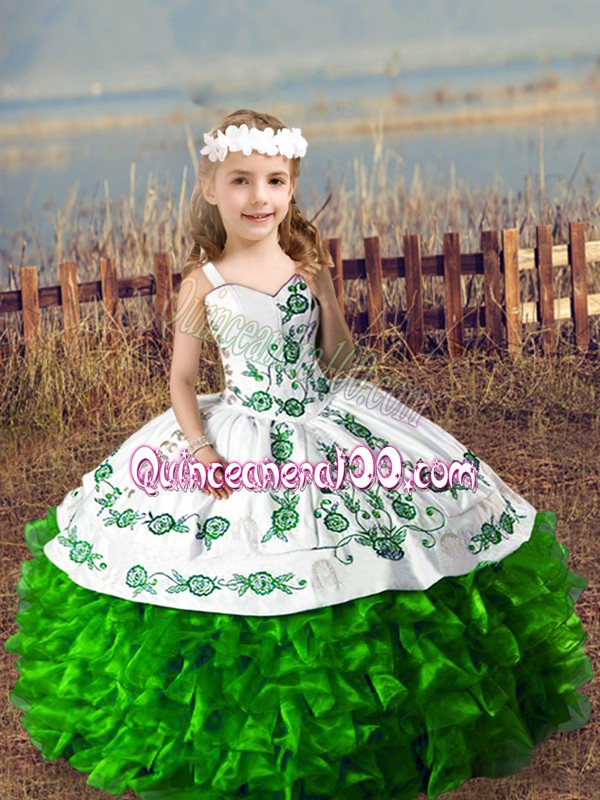Neckline : StrapsShown Color : GreenSilhouette : Ball GownsSleeve Length : sleevelessHemline : floor lengthBack Detail : Lace upFabric : OrganzaEmbellishment : Embroidery,RufflesOccasion : Wedding PartySeason : Spring,Summer,Fall,Winter