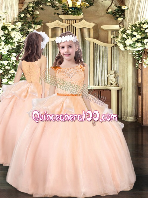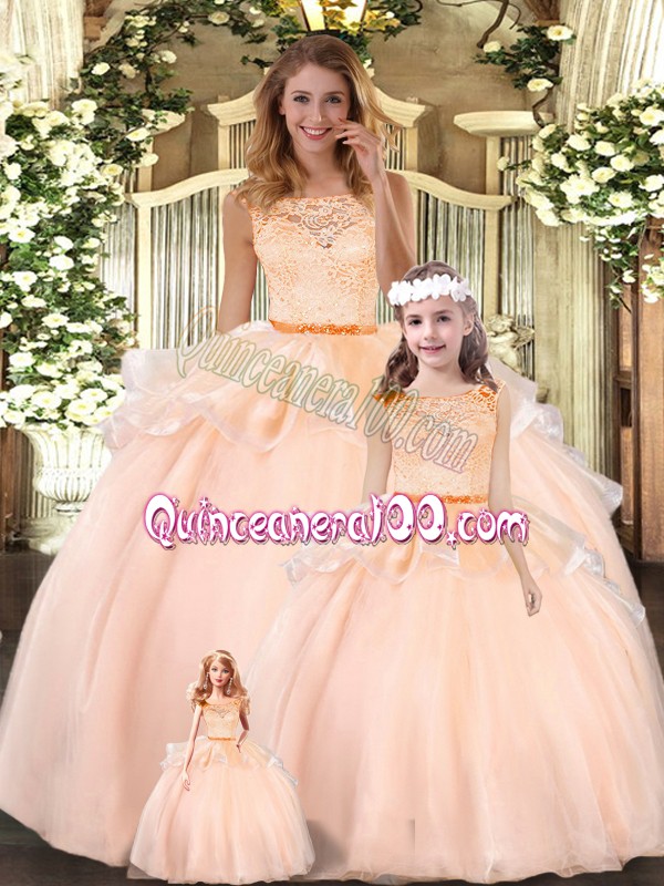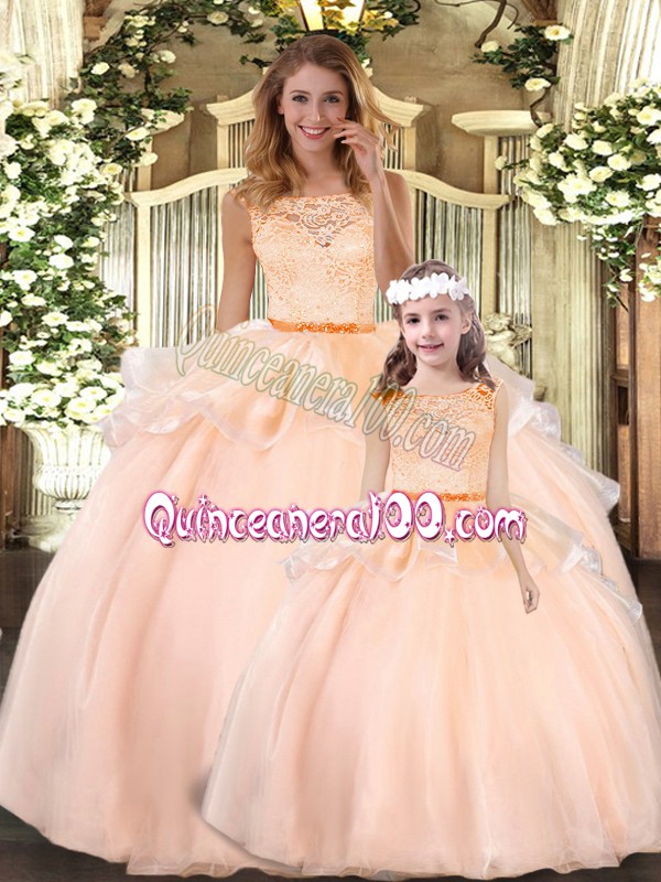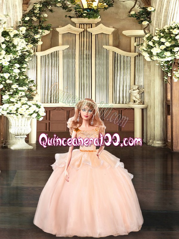 Neckline : ScoopShown Color : PeachSilhouette : Ball GownsSleeve Length : sleevelessHemline : floor lengthBack Detail : ZipperFabric : OrganzaEmbellishment : LaceOccasion : Military Ball,Sweet 16,QuinceaneraSeason : Spring,Summer,Fall,Winter