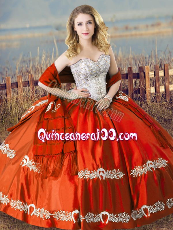 Neckline : SweetheartShown Color : Orange RedSilhouette : Ball GownsSleeve Length : sleevelessHemline : floor lengthBack Detail : Lace upFabric : SatinEmbellishment : Beading,EmbroideryOccasion : Sweet 16,QuinceaneraSeason : Spring,Summer,Fall,Winter