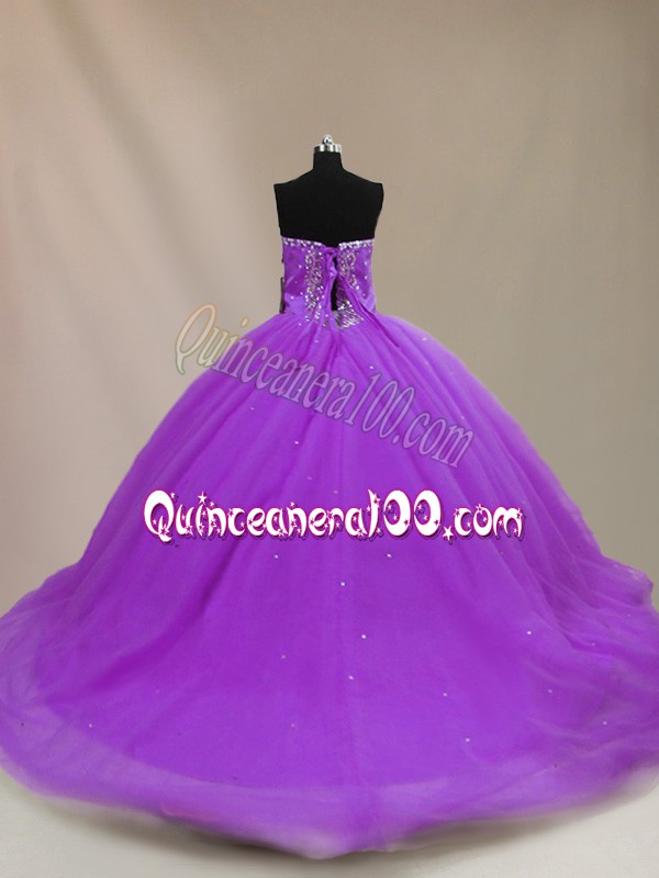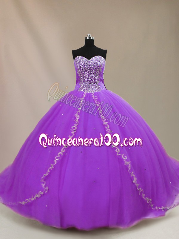 Neckline : SweetheartShown Color : PurpleSilhouette : Ball GownsSleeve Length : sleevelessBack Detail : Lace upFabric : TulleEmbellishment : BeadingOccasion : Sweet 16,QuinceaneraSeason : Spring,Summer,Fall,Winter