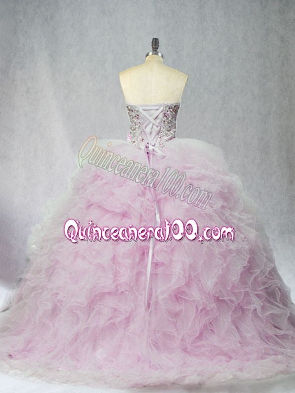 Neckline : SweetheartShown Color : LilacSilhouette : Ball GownsSleeve Length : sleevelessBack Detail : Lace upFabric : TulleEmbellishment : Beading,RufflesOccasion : Sweet 16,QuinceaneraSeason : Spring,Summer,Fall,Winter